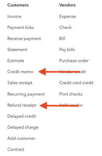 - Create either a Credit memo or a Refund receipt as you normally would, and select a customer and add line items to the sale.