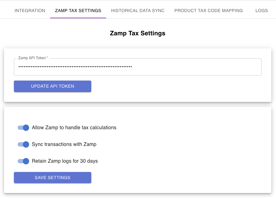 - Select Launch under Zamp Tax. You will be authenticated and taken to the Zamp Tax app's configurations and settings page.