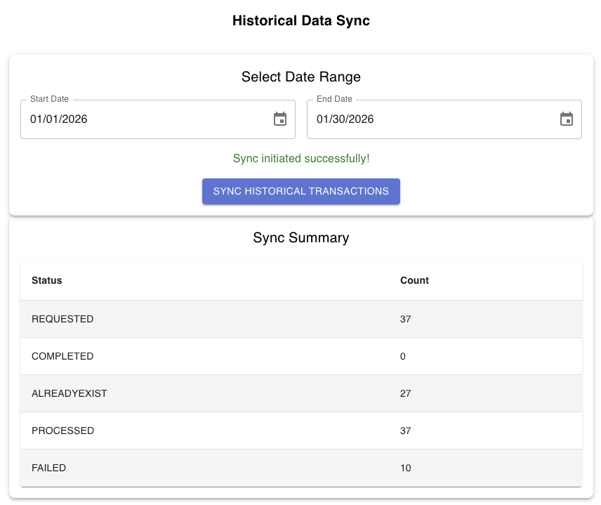 - Under Historical Data Sync, you have the option to transmit sales records by a Start Date and an End Date to your Zamp account. This is important for filing both prior-period and present-period transactions.
