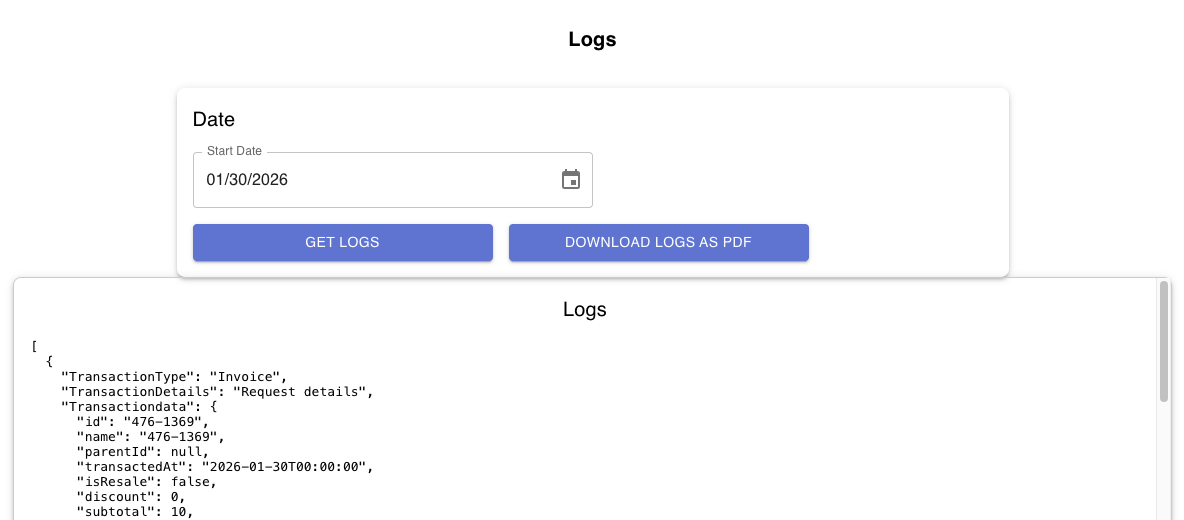 - To retrieve Logs, navigate to the Logs menu. Choose the date of the API activity you would like to review. Supply these logs to our Support or Engineering teams if you ever have questions around sales tax calculations or transaction history.